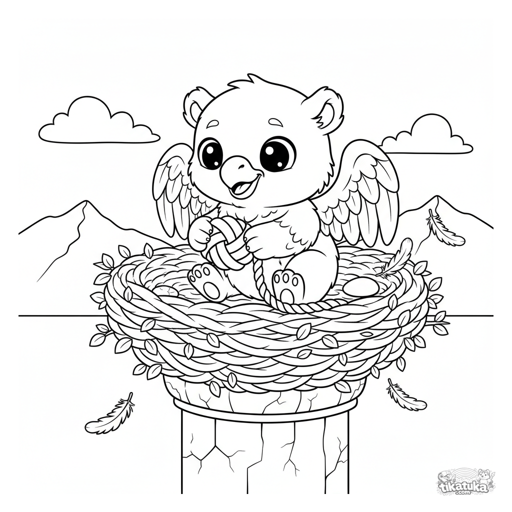 Página para colorear de un polluelo de grifo jugando con una cuerda en su nido sobre un pilar de piedra. Para niños de 4-6 años.