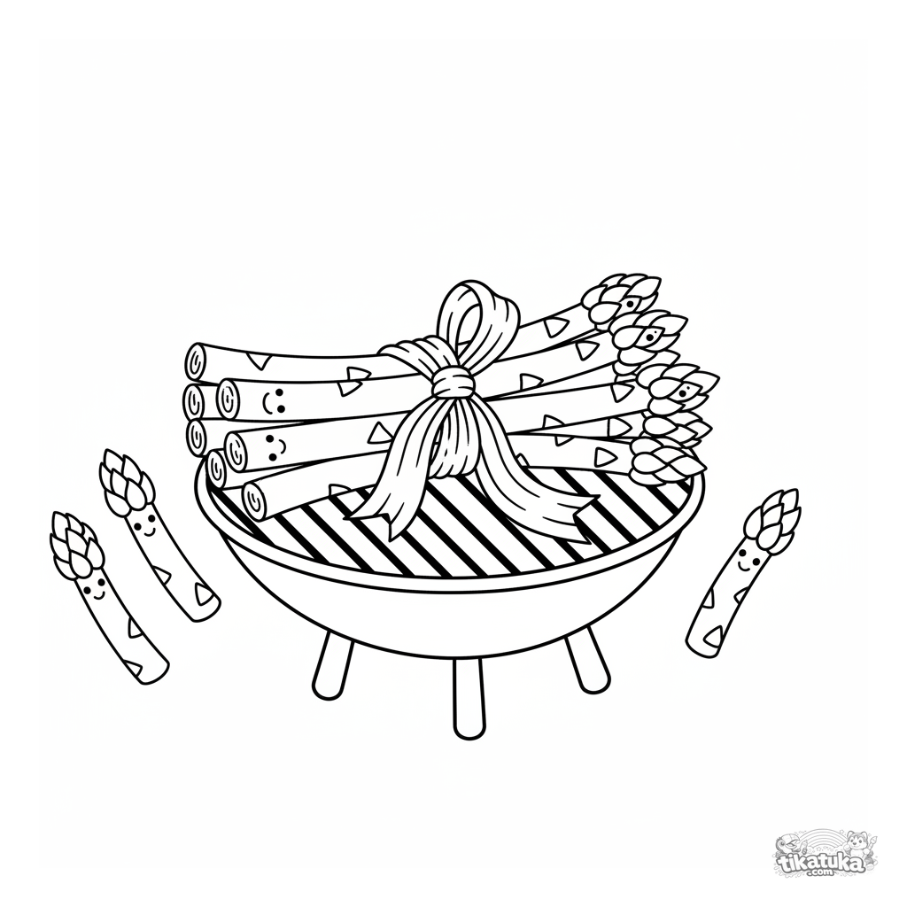Página para colorear para niños pequeños de 2-3 años: un atado simple de espárragos atado con puerro, en una parrilla de jardín. Formas grandes y claras.