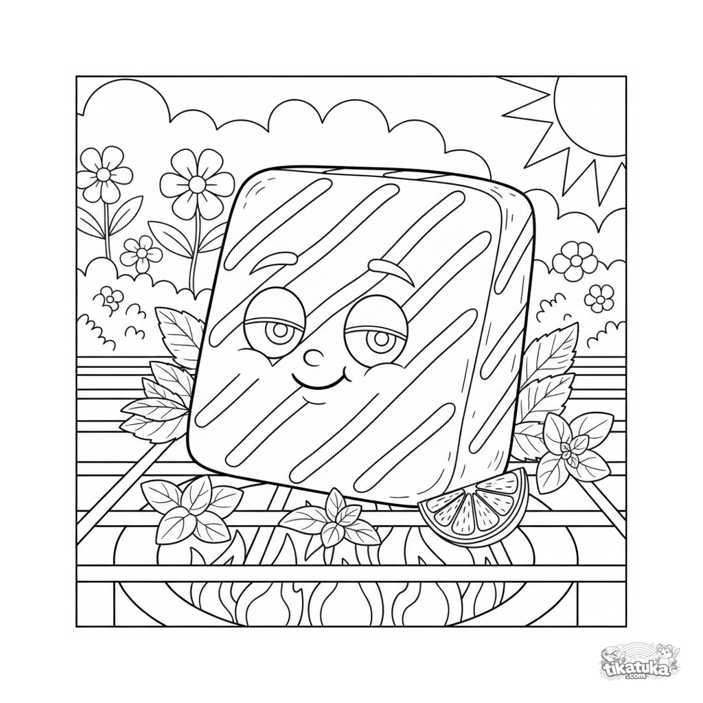 Página para colorear detallada para niños mayores de 10-12 años: queso halloumi con marcas de parrilla, hierbas y limón en un jardín. Textura realista.
