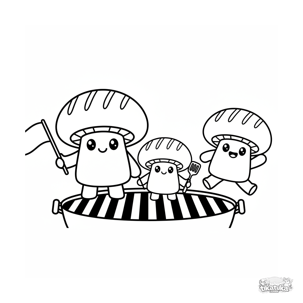 Página simple para colorear para bebés de 2 a 3 años. Tres alegres champiñones portobello parados en una parrilla saludan. Formas muy grandes y simples.