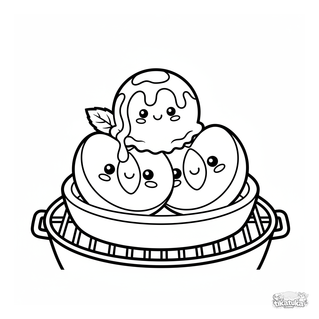 Página simple para colorear para niños 2-3: mitades de melocotón en la parrilla con una bola de helado. Formas muy grandes y abiertas para colorear.