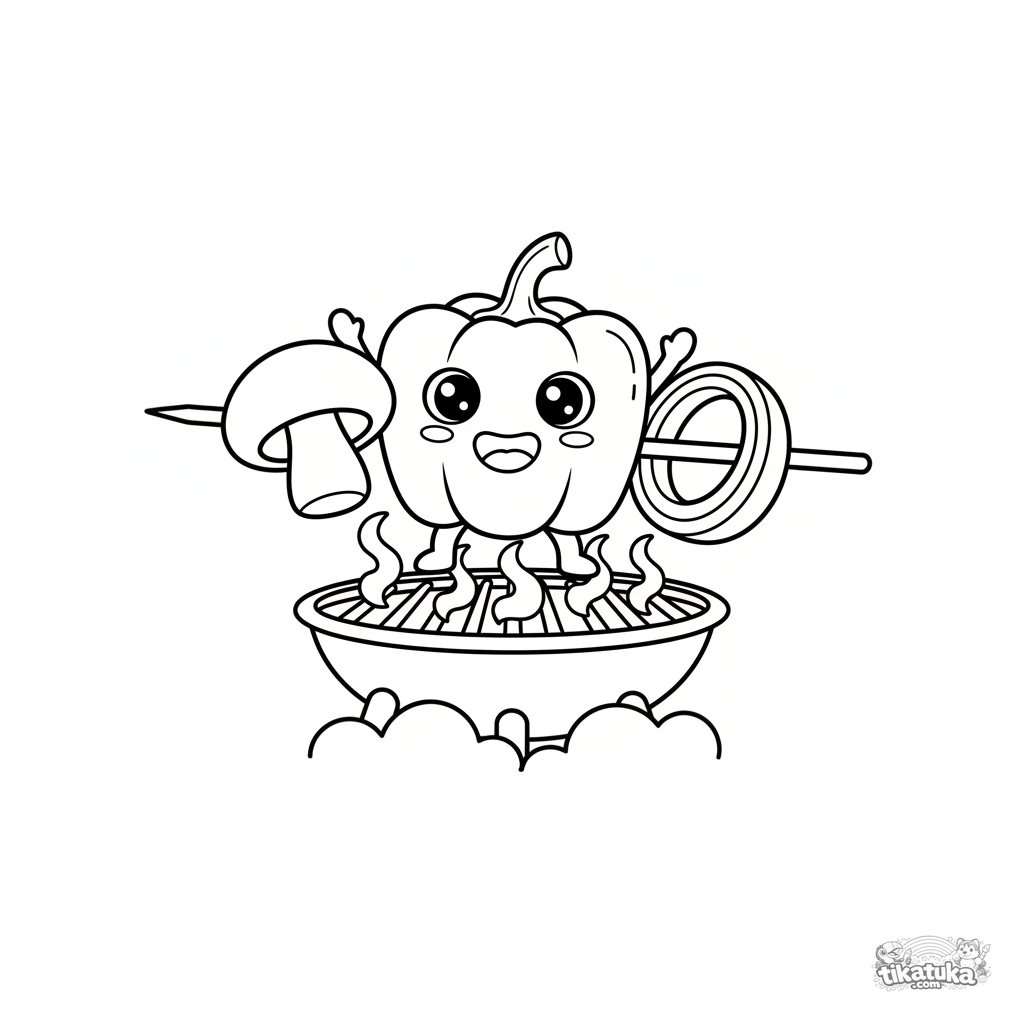Página simple para colorear para bebés de 2 a 3 años. Un alegre pimiento en una brocheta baila en una parrilla de jardín. Formas grandes, pocos detalles.