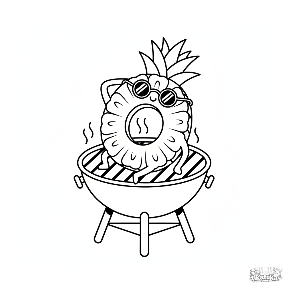 Página para colorear simple para niños pequeños 2-3: un anillo de piña con gafas de sol tomando el sol en una parrilla. Formas grandes y claras.