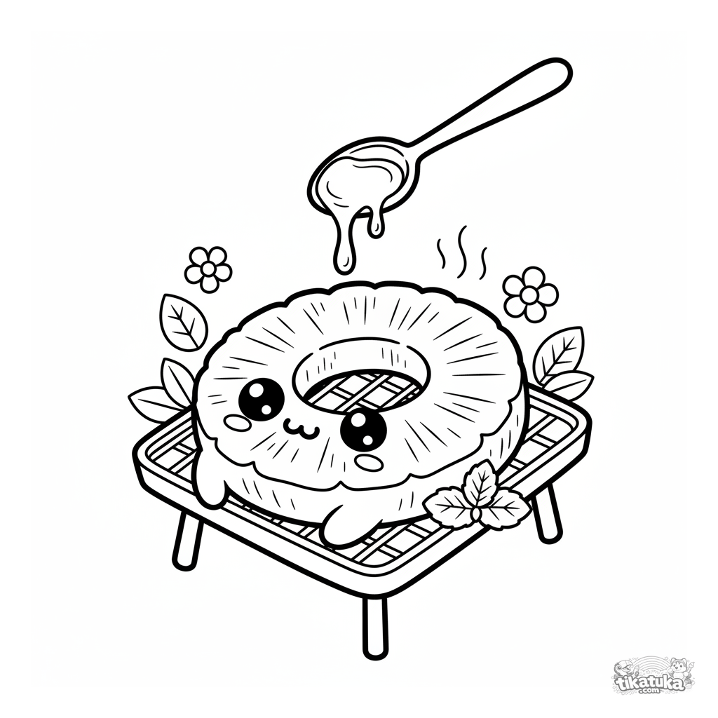 Página para colorear para niños 7-9: una linda rodaja de piña en la parrilla con hilo de caramelo. Detalle moderado, cara expresiva.