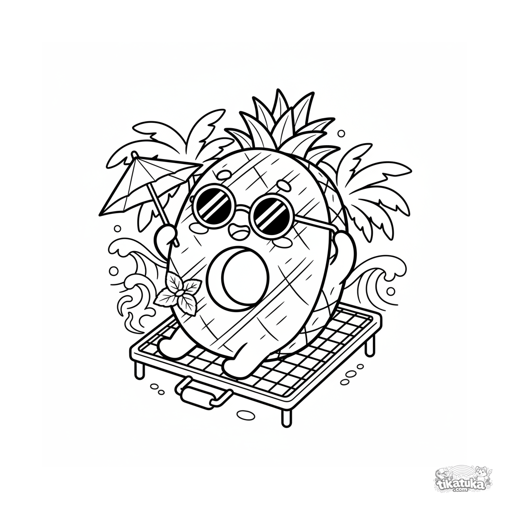 Página para colorear de una piña en la parrilla para niños de 7-9 años. El anillo de piña lleva gafas de sol y sostiene una sombrilla, relajándose en la parrilla.