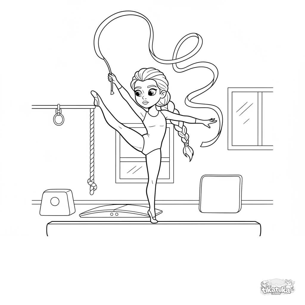 Página para colorear: una gimnasta realiza una rutina con cinta en la viga de equilibrio en un gimnasio. Para 4-6 años, escena de equilibrio y gracia.
