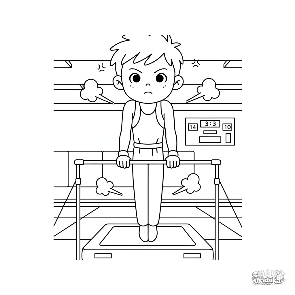 Página para colorear para niños: un niño gimnasta practica en la barra fija en un gimnasio. Para 4-6 años, escena simple.