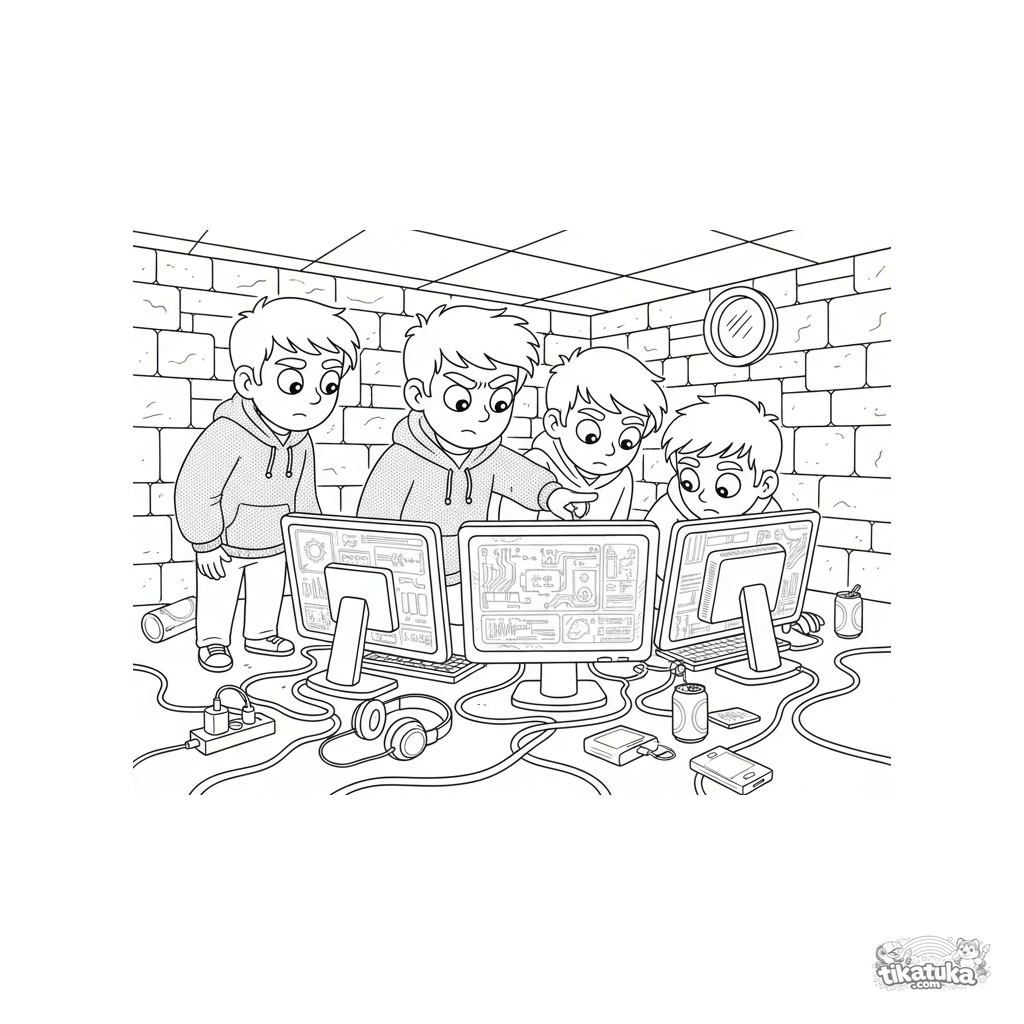 Página para colorear para niños de 10-12 años: un equipo de jóvenes hackers colaborando en un sótano lleno de monitores y cables. Escena detallada para colorear.