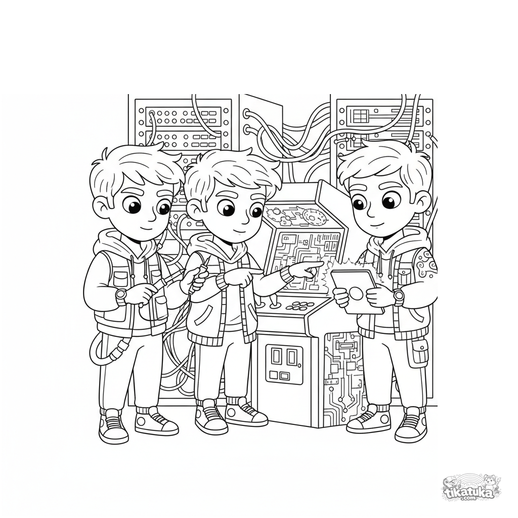 Página para colorear para niños 10-12: un equipo de hackers en un sótano arreglando una máquina arcade vintage. Escena detallada con racks de servidores y cables.