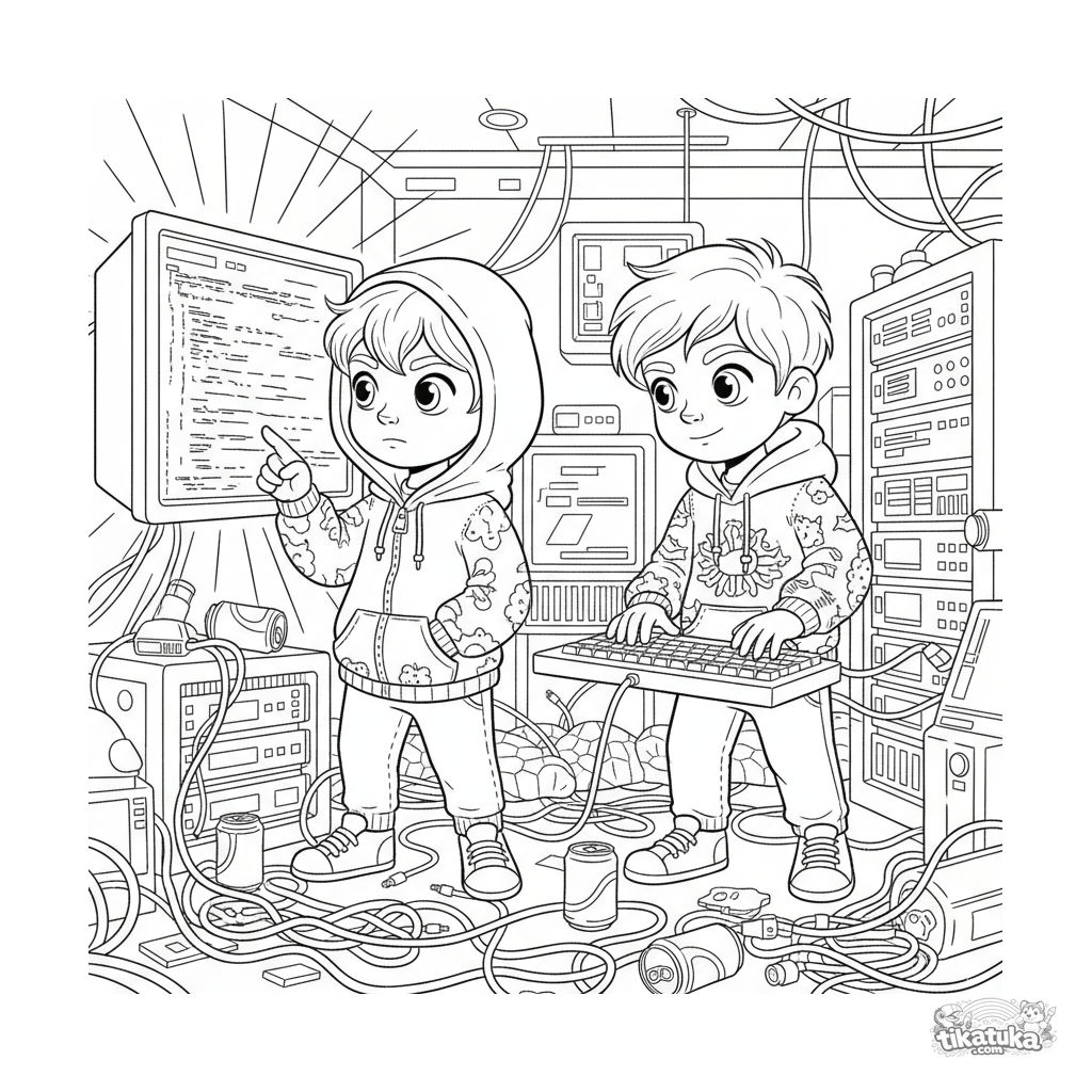 Página para colorear para niños de 10-12 años: dos hackers colaboran en un sótano lleno de pantallas y cables. Escena de alto detalle.