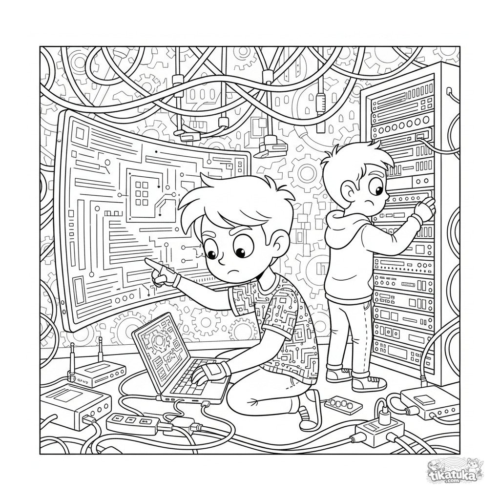Página para colorear para niños de 10-12 años: un dúo de hackers en un sótano con pantallas, trabajando en código. Escena compleja con cables, servidores y fondo detallado.