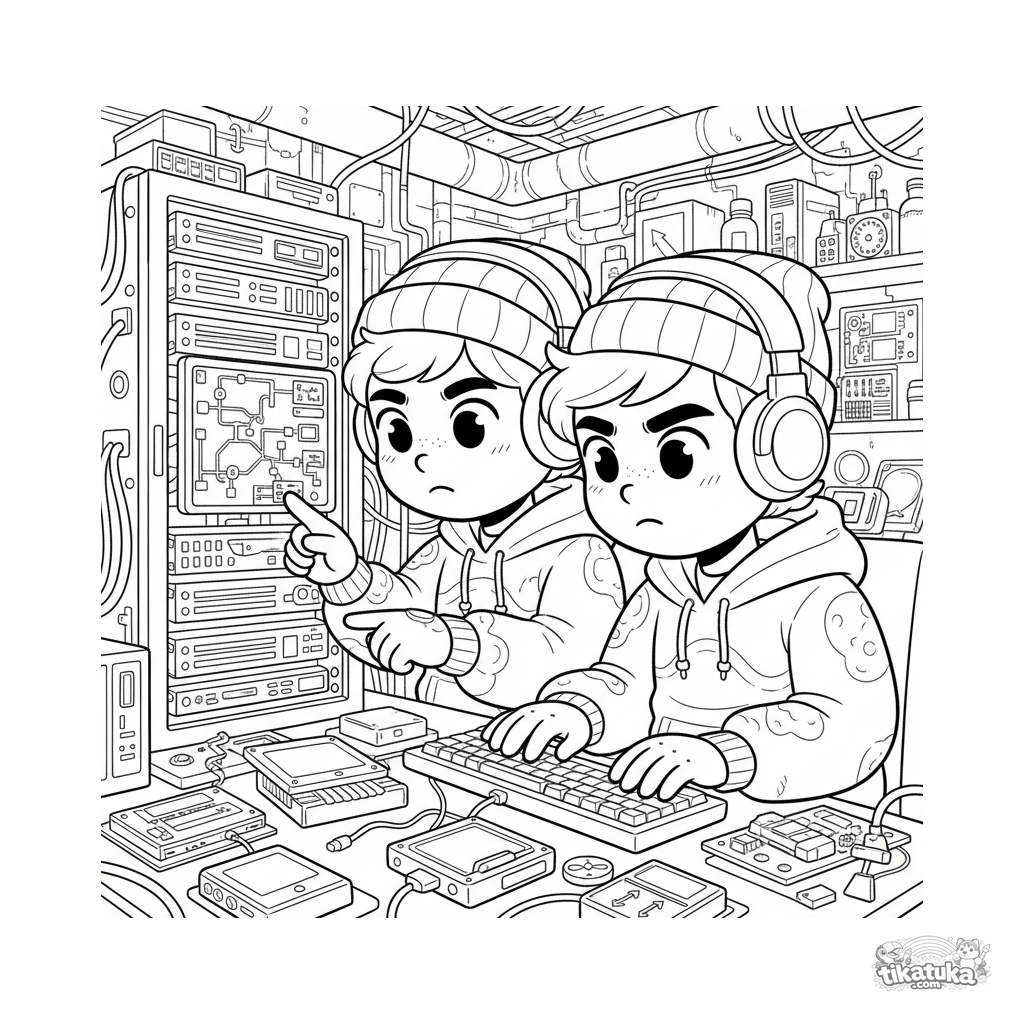 Página para colorear para 10-12 años: dos hackers trabajando en un sótano con servidores y pantallas. Escena llena de detalles: cables, teclados, luces parpadeantes.