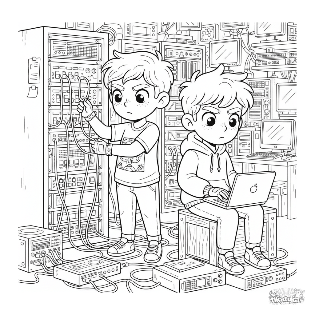 Página para colorear para niños de 10-12 años: dos adolescentes trabajan en equipos de servidor en un sótano de hackers lleno de cables y pantallas parpadeantes.