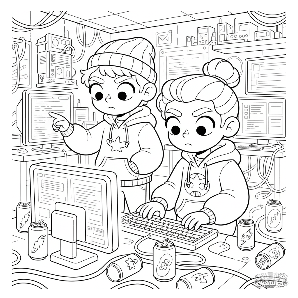 Página para colorear para 10-12 años: un dúo de hackers trabaja en una terminal en un sótano. Escena detallada con pantallas, cables y latas.