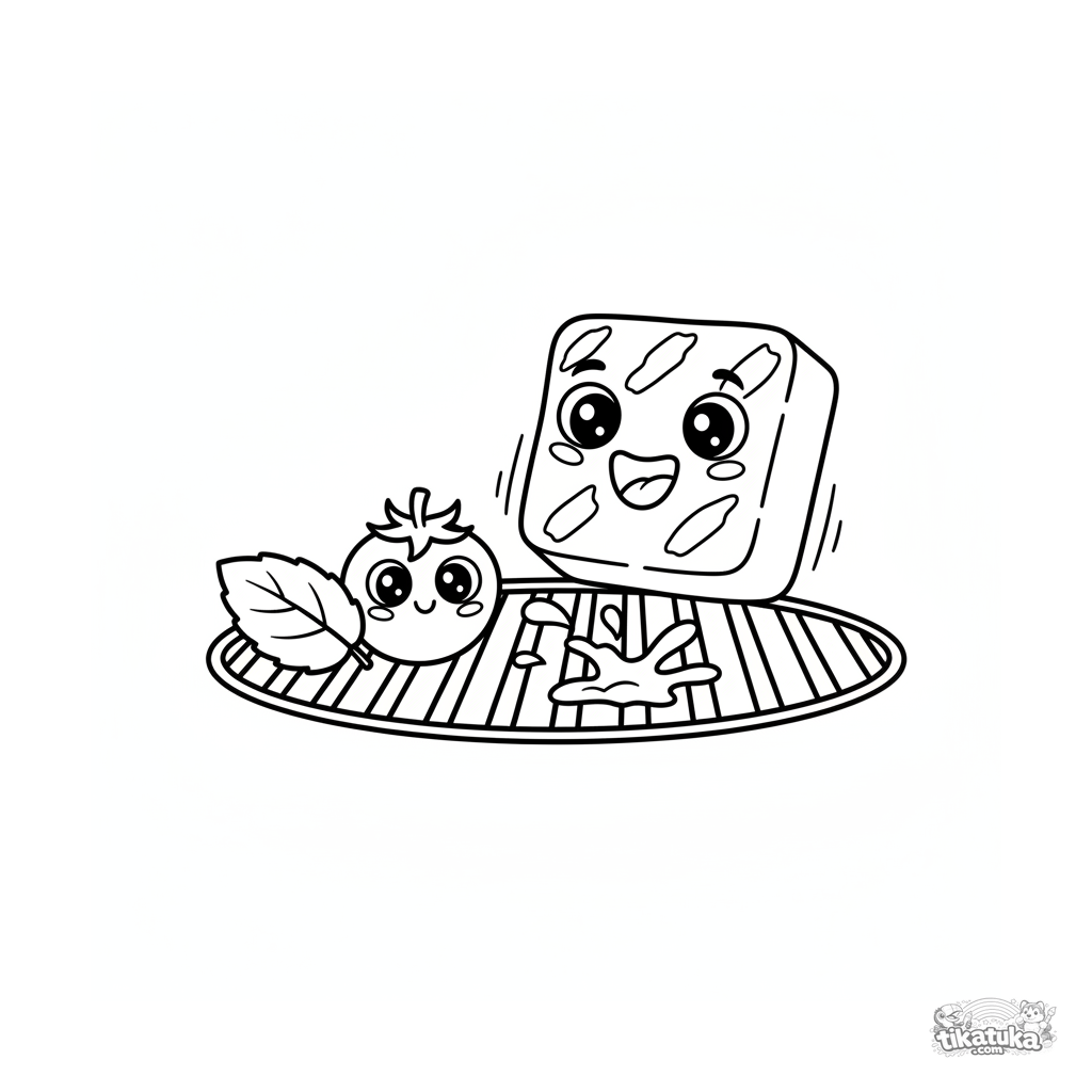 Página divertida para colorear para niños pequeños 2-3: una rebanada de queso halloumi salta en la parrilla. Contornos muy simples y gruesos, una figura grande.