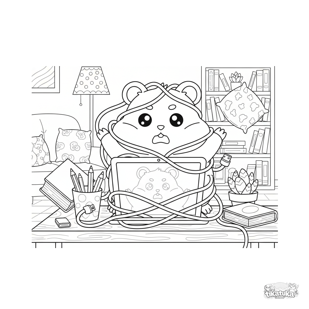 Página para colorear para niños mayores: un hámster se enreda en cables causando caos durante una videollamada. Escena divertida y detallada al estilo anime.