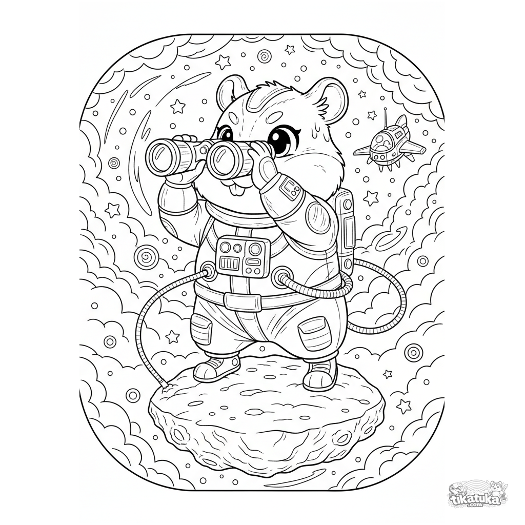Página para colorear para niños 10-12: un hámster en traje espacial sobre un asteroide, escaneando el espacio con prismáticos de alta tecnología. Escena de meme espacial absurda y detallada.