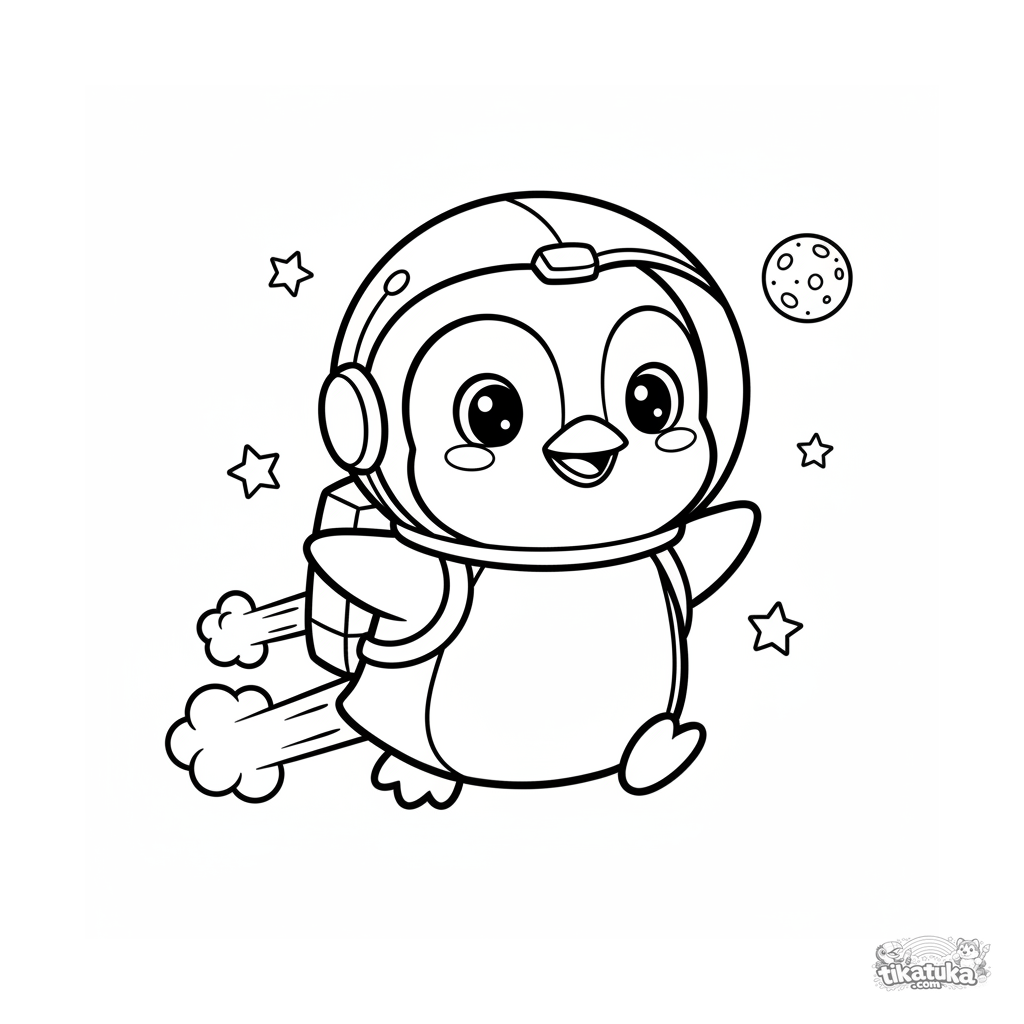 Página para colorear para niños de 4-6 años: un pingüino feliz con casco se desplaza entre estrellas usando una mochila propulsora. Estilo chibi.