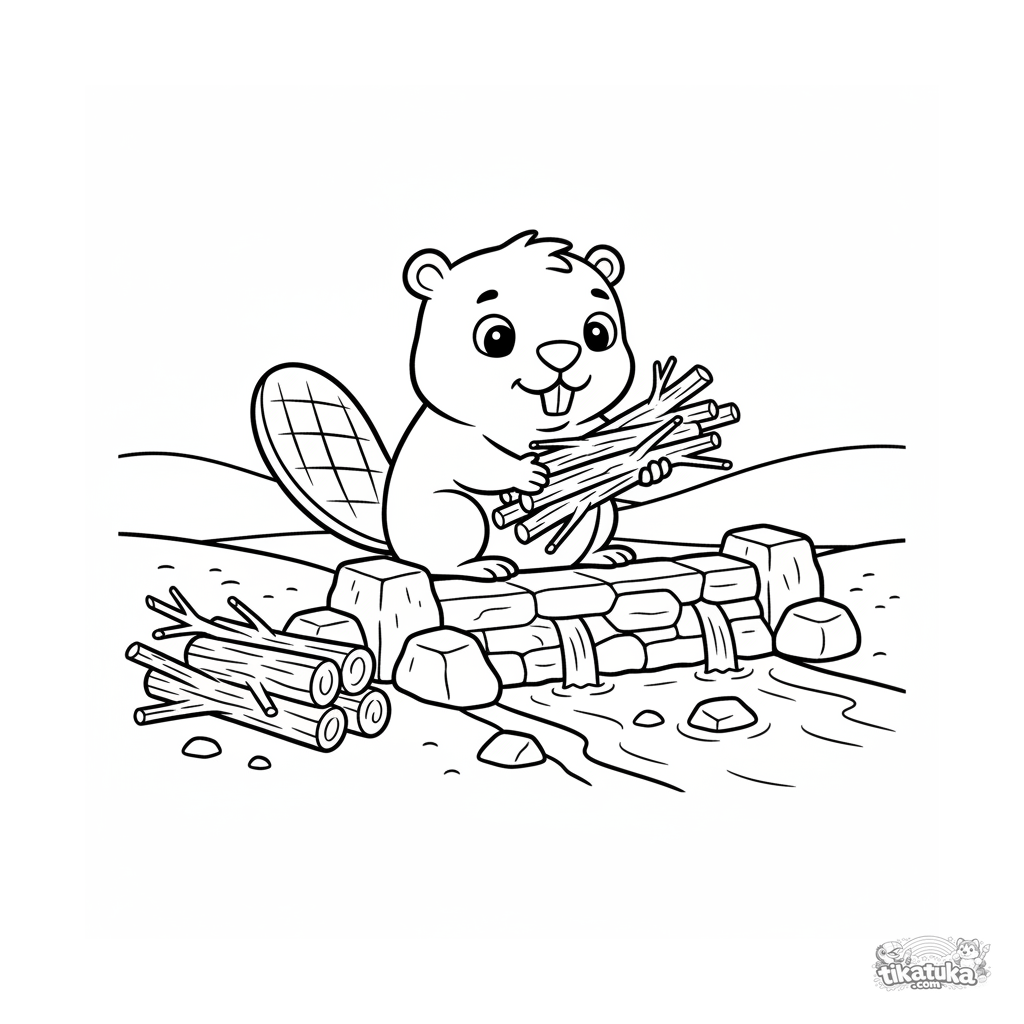 Página para colorear muy simple para niños pequeños 2-3 en estilo juguete de madera: un castor sonriente construye una presa con palos en la orilla de un arroyo.