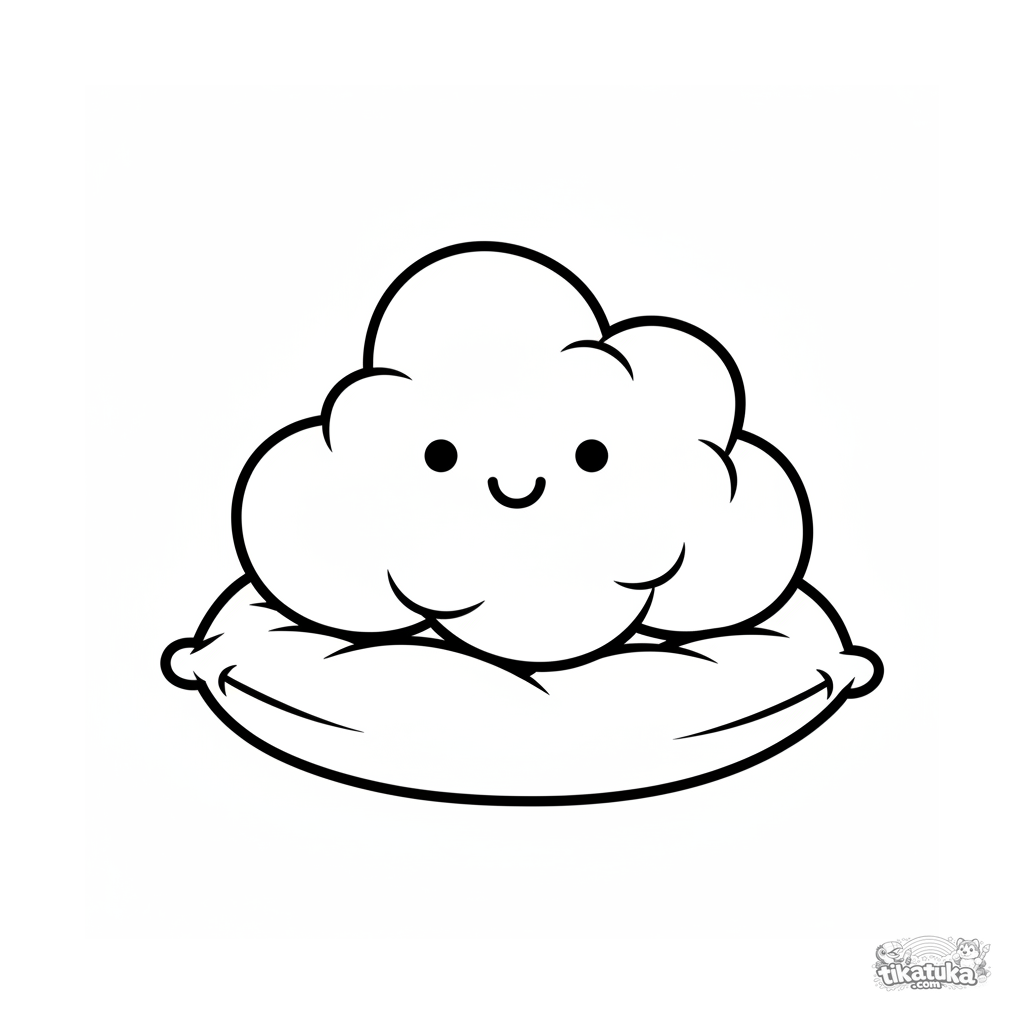Página para colorear para los más pequeños: una nubecita esponjosa y sonriente descansa en un almohadón suave. Formas simples enormes, mínimo detalle.