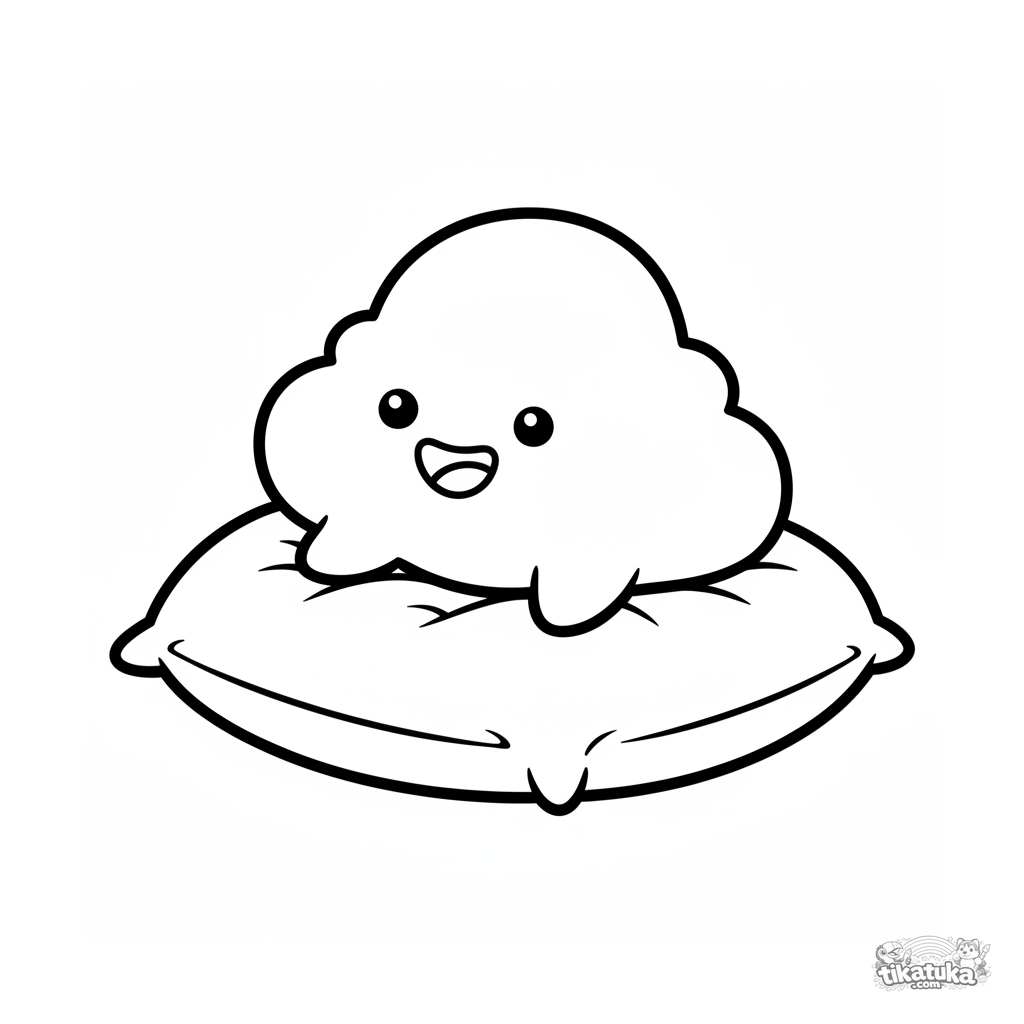 Página para colorear para niños pequeños: una nube sonriente descansa en una almohada. Contornos grandes y claros, detalles mínimos.