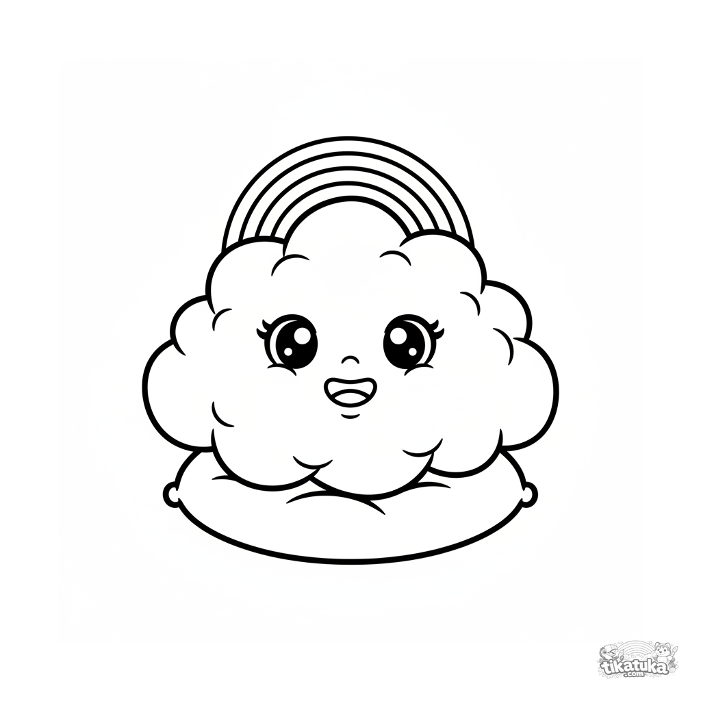 Página para colorear para los más pequeños: una nube esponjosa y feliz con un arcoíris en la cabeza flota sobre un cojín suave. Contornos muy simples y grandes con amplios márgenes.