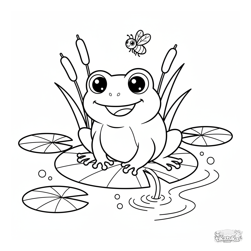 Página para colorear muy simple para niños pequeños 2-3: una rana feliz en un nenúfar. Formas grandes, detalles mínimos, contornos gruesos.