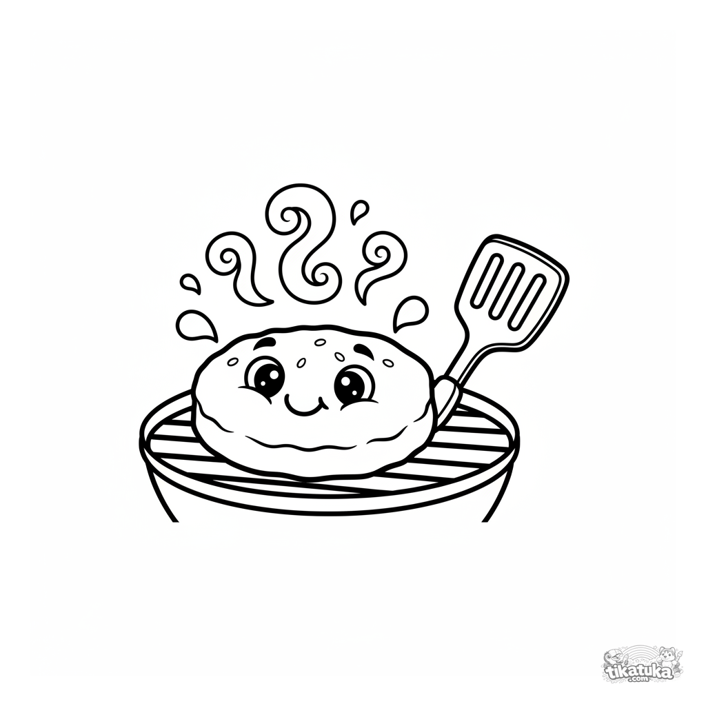 Página para colorear sencilla de una hamburguesa en una parrilla de jardín. Para niños pequeños de 2 a 3 años. Formas grandes, pocos detalles.