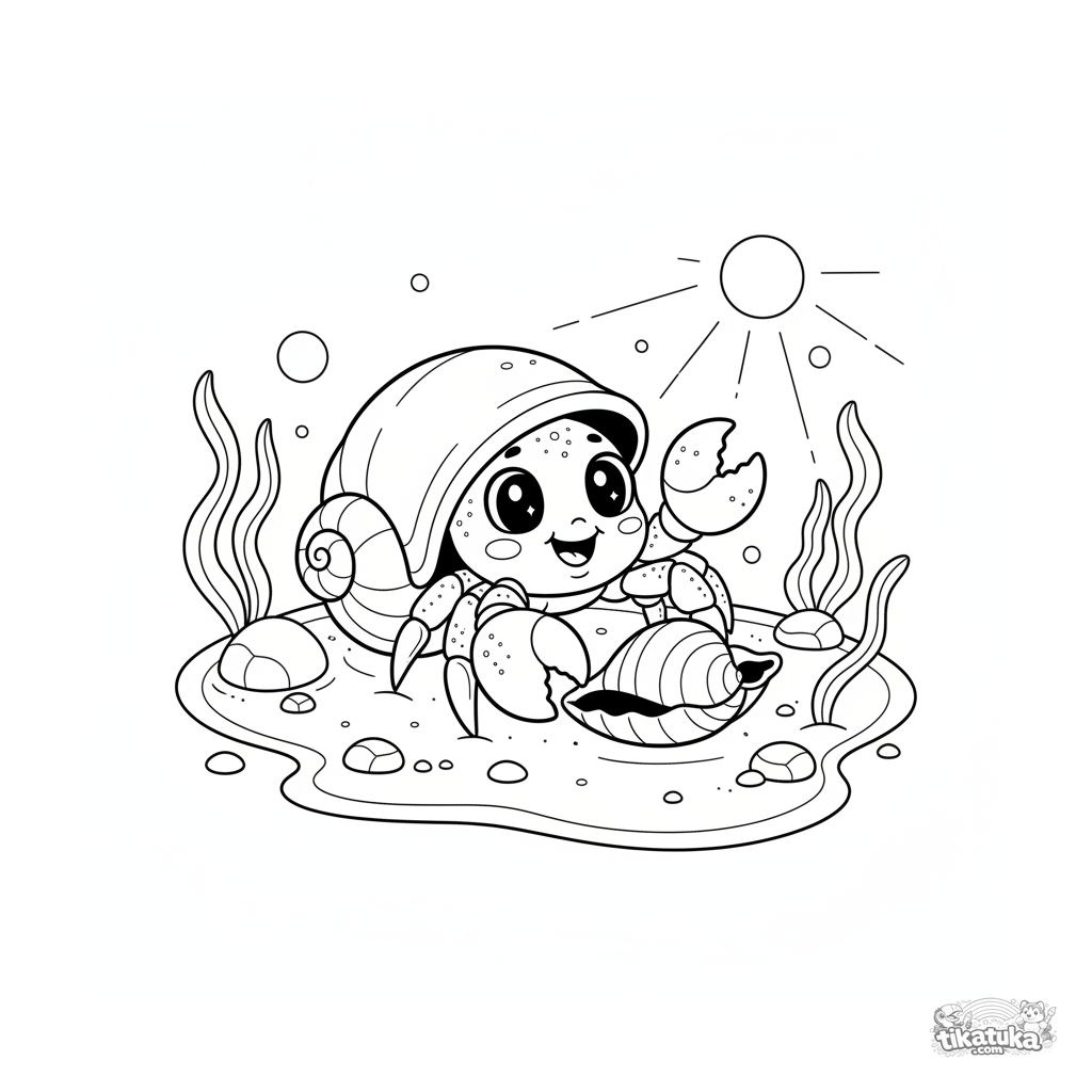 Página para colorear para 4-6 años: un lindo cangrejo ermitaño eligiendo una nueva casa en una poza de marea soleada. Estilo chibi.