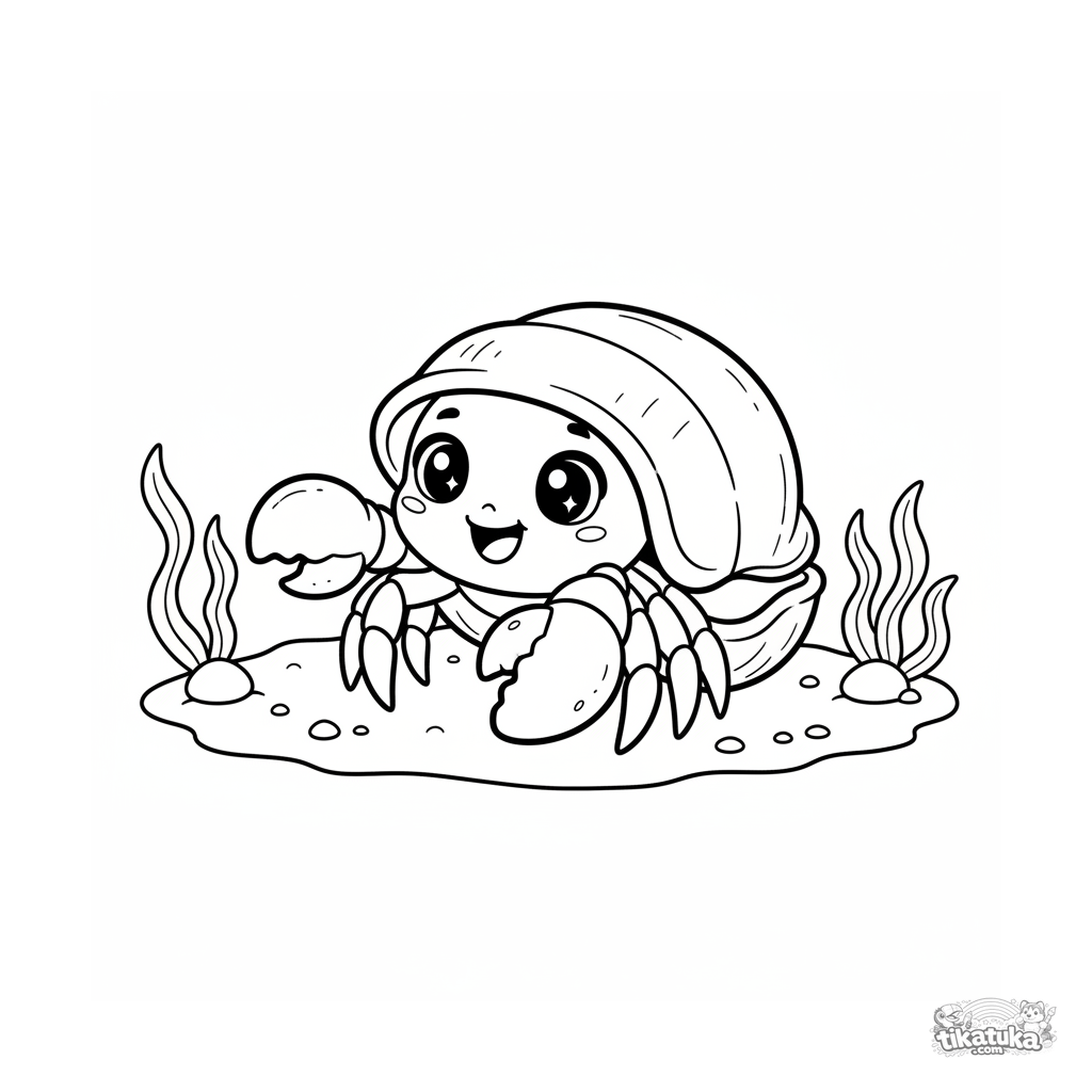 Página para colorear de un cangrejo ermitaño cambiando de concha bajo el sol. Para 4-6 años. Estilo chibi tierno, escena simple.