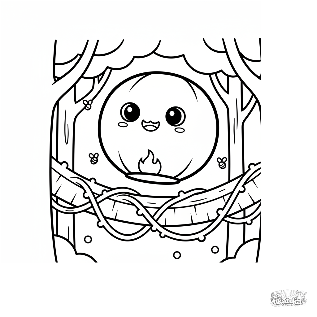 Página para colorear simple para niños pequeños: un espíritu linterna sonriente flota por un puente de enredaderas brillantes. Formas grandes, márgenes amplios.