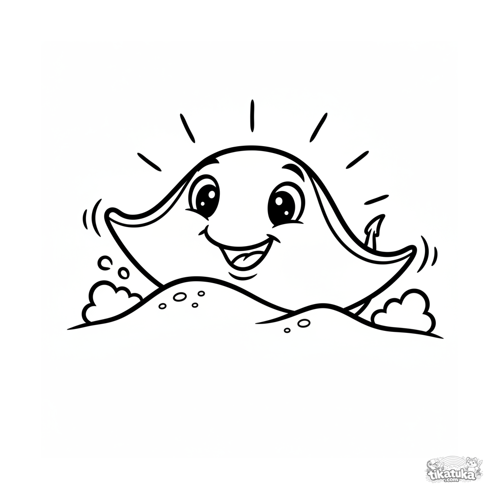 Página simple para colorear para niños pequeños: una raya sonriente se esconde en la arena cálida en aguas poco profundas soleadas.