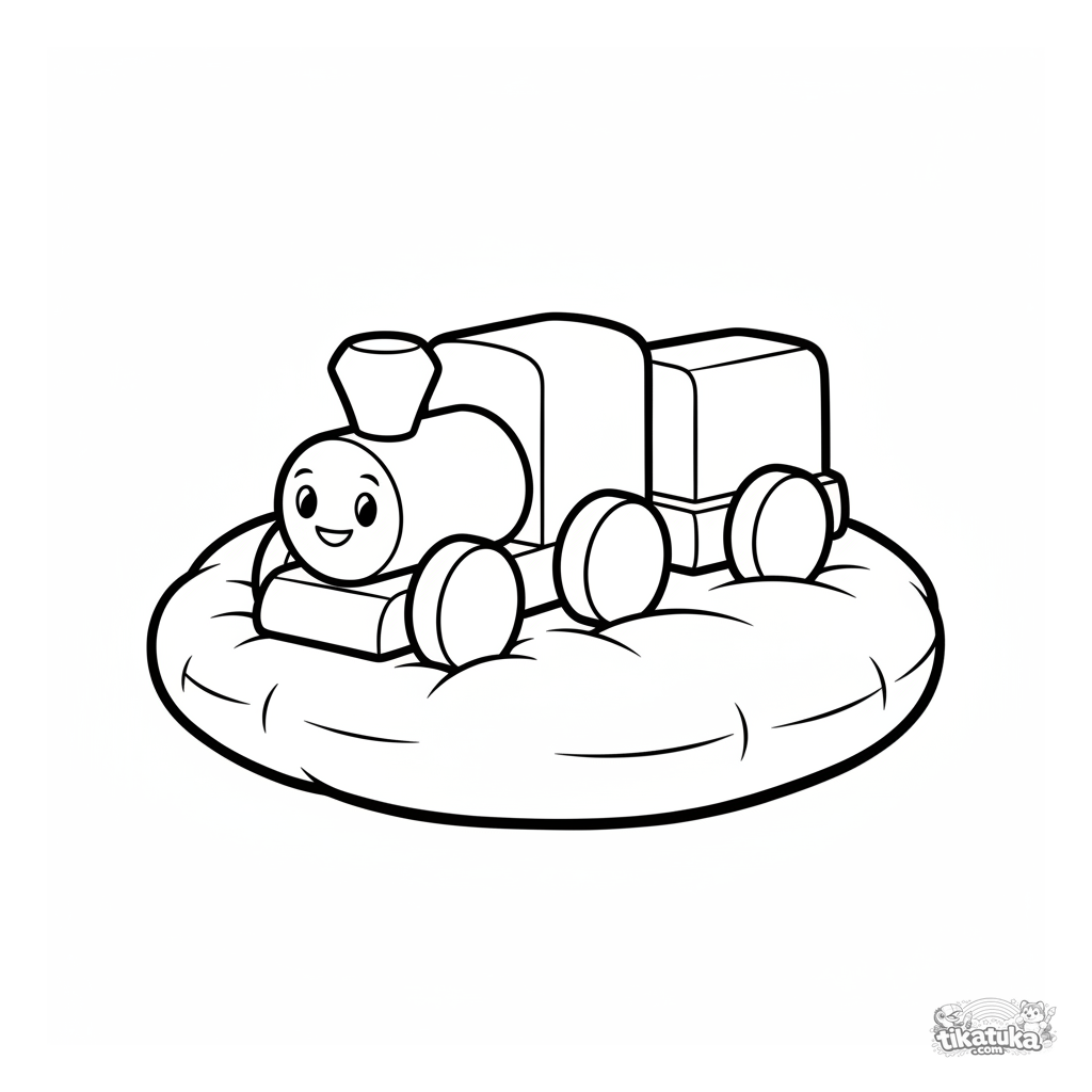 Página para colorear para niños pequeños: un tren de bloques de madera feliz sentado en un cojín suave. Formas grandes y simples, cara amigable, perfecto para 2-3 años.