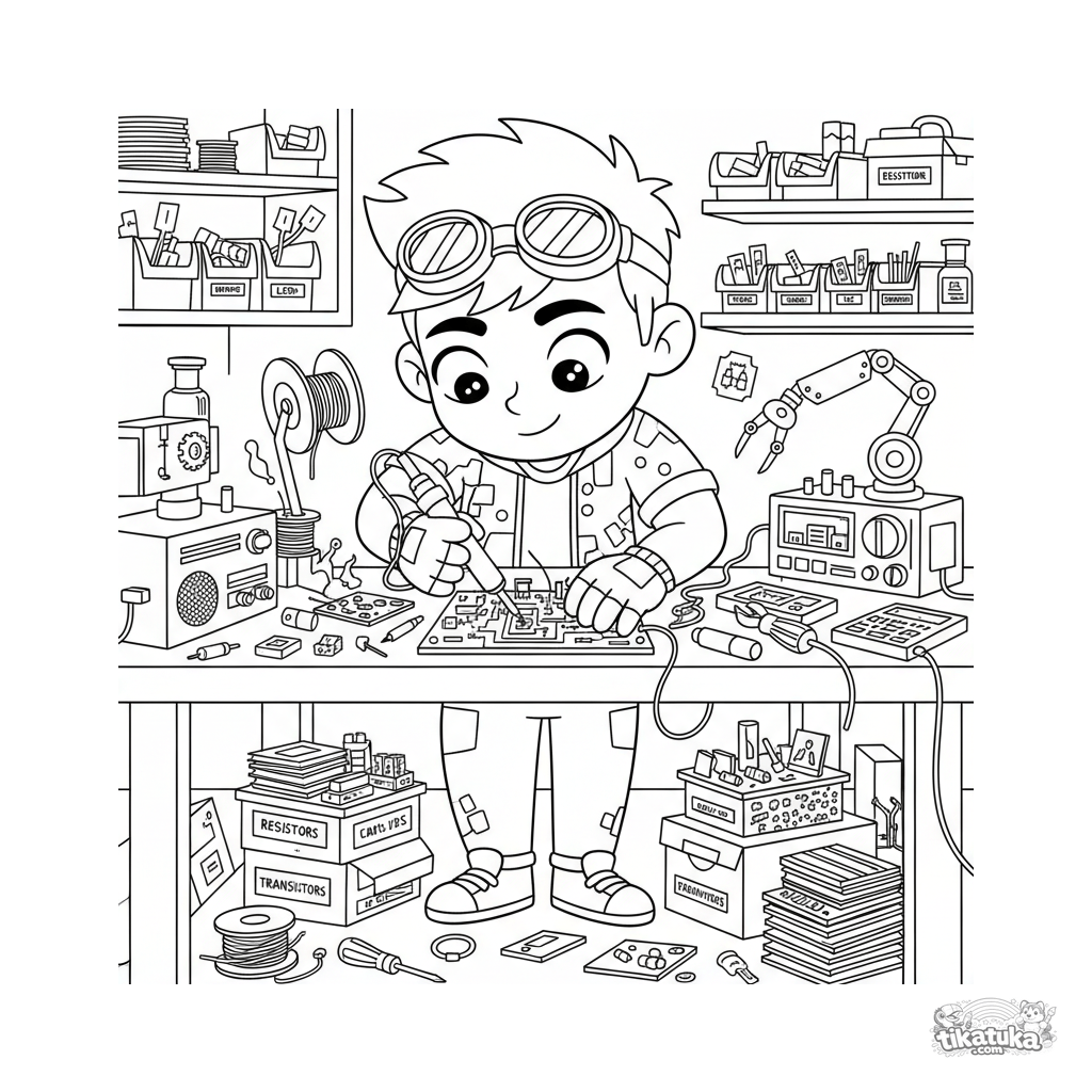 Página para colorear detallada para 10-12 años: un modificador de hardware soldando una placa en un taller de sótano. Muchas herramientas, contenedores de piezas, gadgets desmontados.