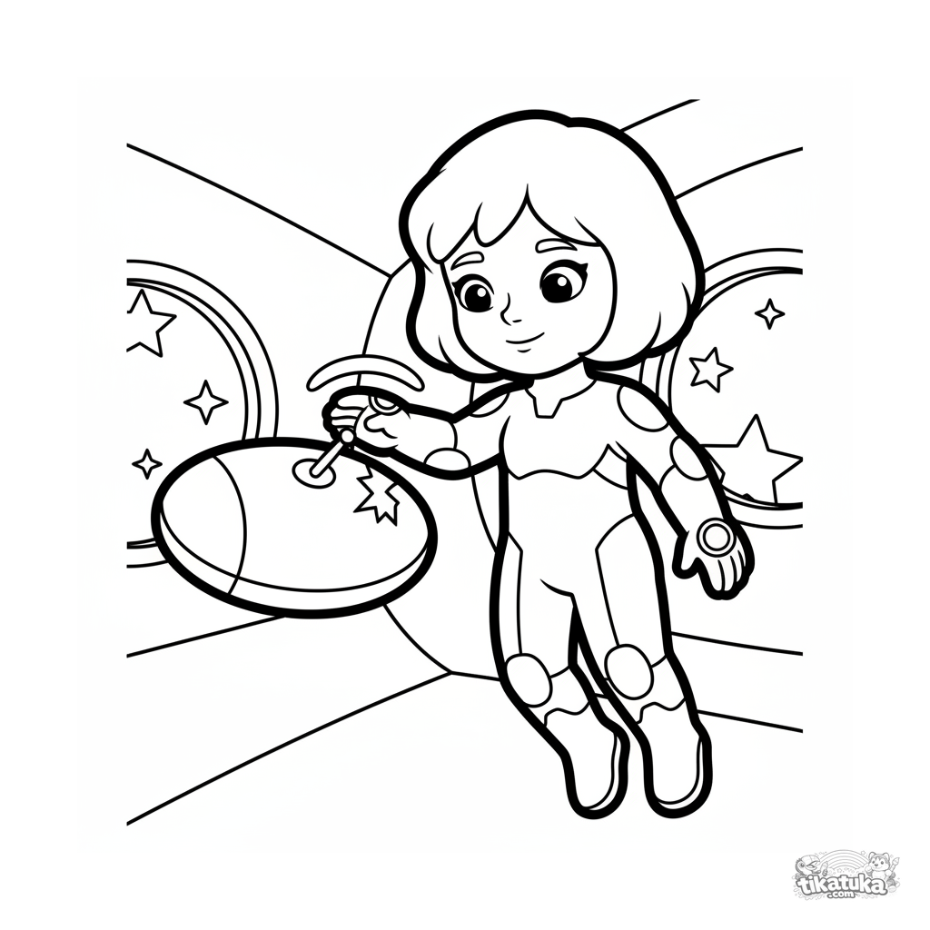 Página para colorear simple para niños pequeños 2-3: un héroe sanador en traje blanco flota en un pasillo de estación espacial, ayudando a un dron satélite.