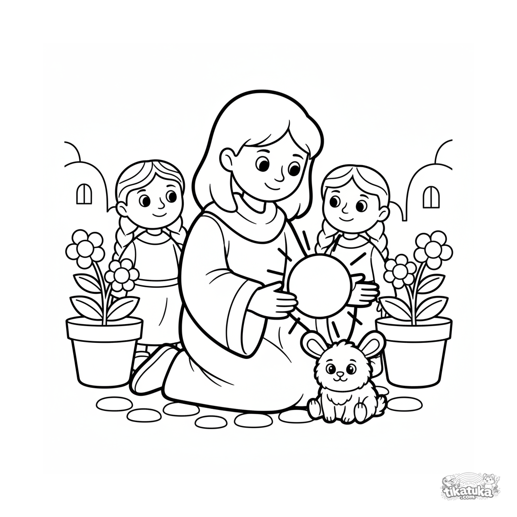 Página para colorear para niños pequeños 2-3: un héroe sanador con manos brillantes ayuda a un animal en una plaza. Formas simples, detalles grandes.