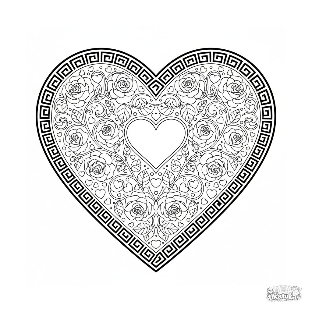 Página para colorear de mandala en forma de corazón detallada para 10-12 años. Corazón central, vides florales en espiral y borde geométrico griego en simetría perfecta.