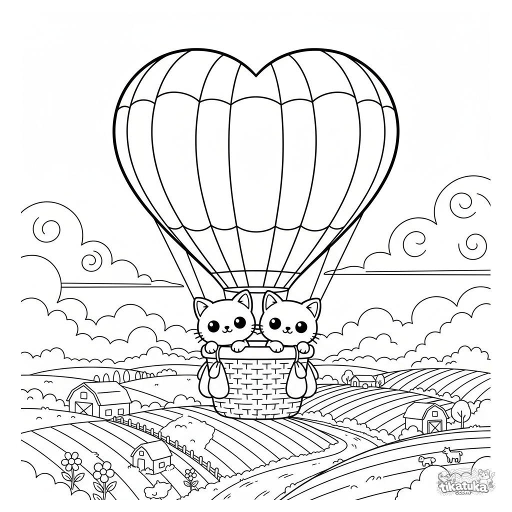 Página para colorear para niños 4-6: un lindo globo aerostático en forma de corazón flota sobre una pradera de retazos al atardecer. Dos gatitos felices están en la cesta.