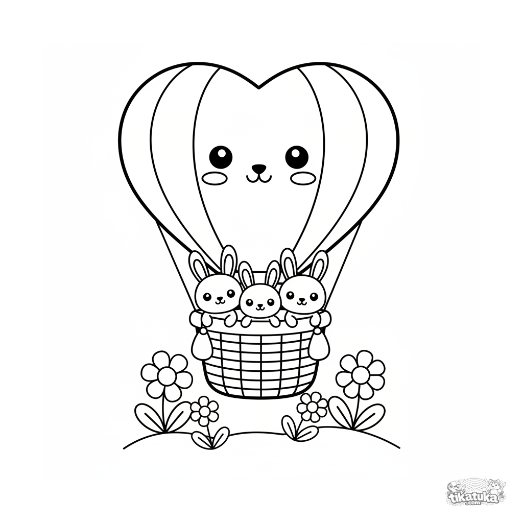 Página para colorear simple y tierna de un globo aerostático con forma de corazón en un prado. Para niños pequeños de 2-3 años. Grandes áreas abiertas para colorear.