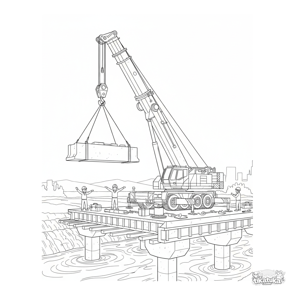 Página para colorear compleja para 10-12 años: una grúa detallada trabajando en la construcción de un puente sobre un río. Para amantes de la maquinaria.