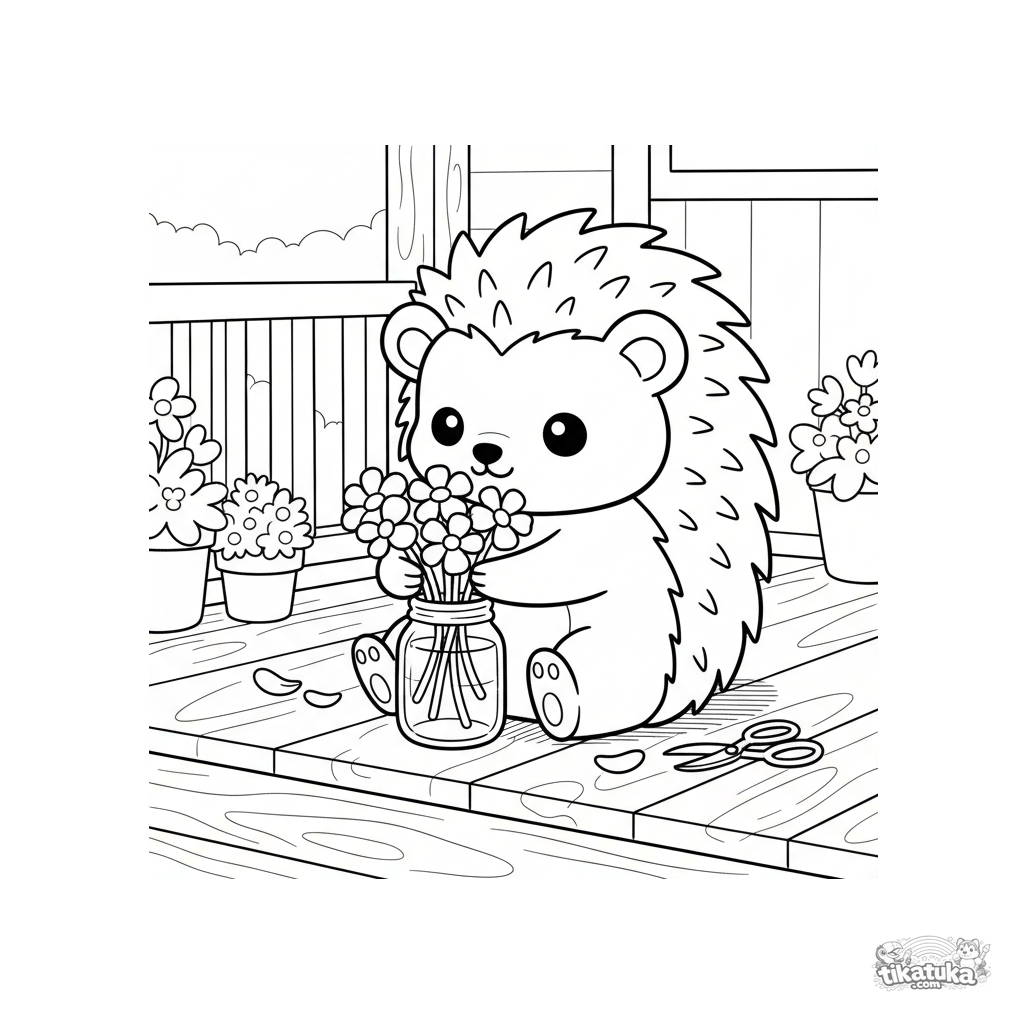 Página para colorear para niños de 4 a 6 años: un lindo erizo arregla un ramo de flores silvestres en un frasco en el escalón de un porche.