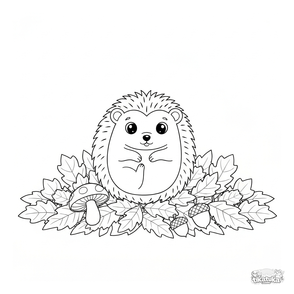 Página para colorear de otoño para niños pequeños: un erizo duerme en un montón de hojas. Formas simples, escena acogedora, para 2-4 años.