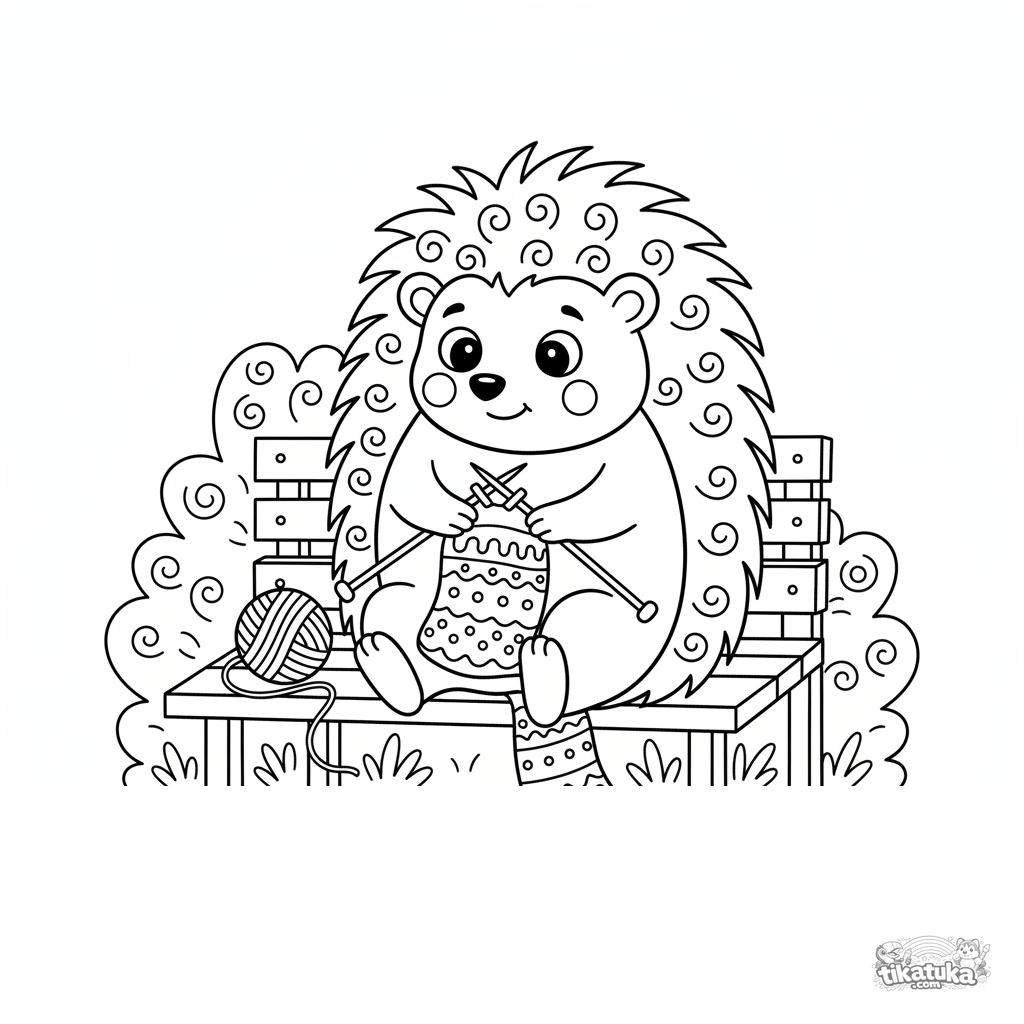 Página para colorear para niños 7-9: un erizo tejiendo una bufanda en un banco de parque otoñal. Escena acogedora en estilo folclórico.