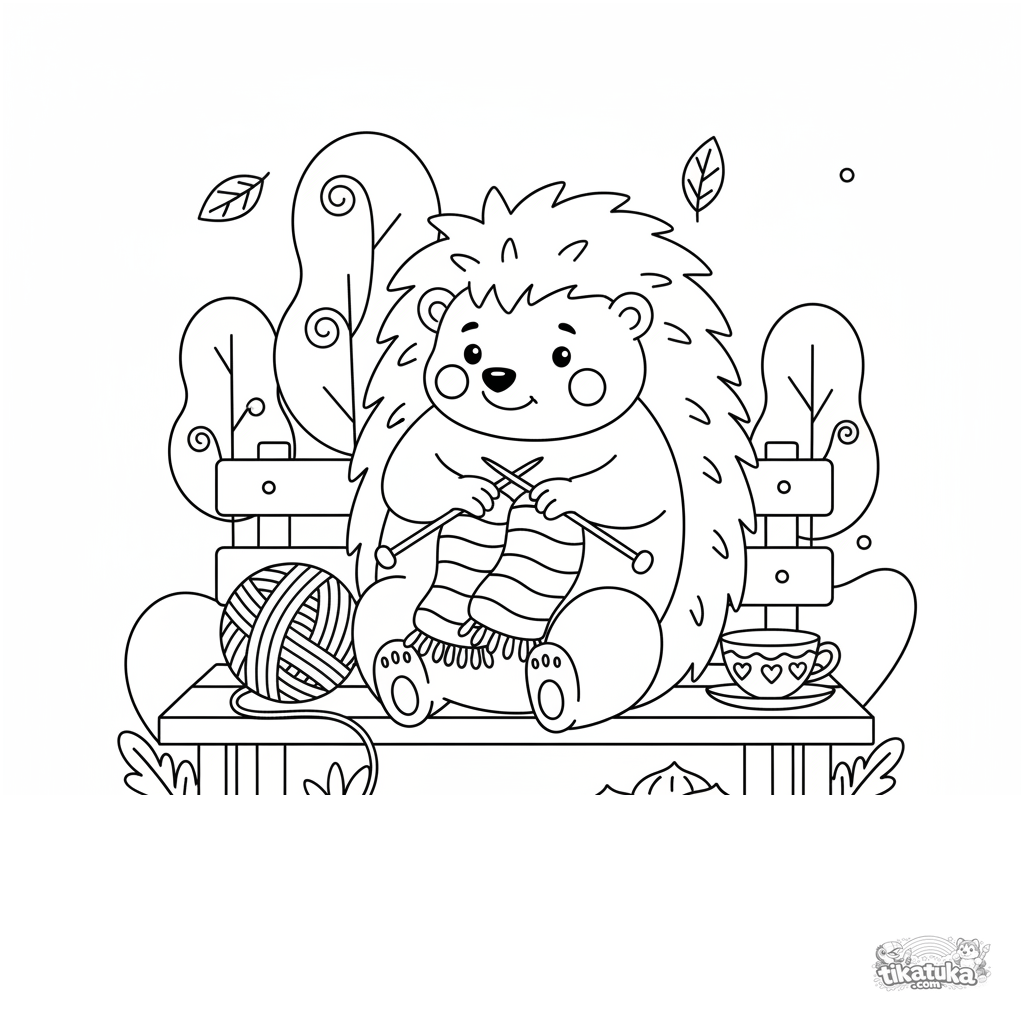 Página para colorear para niños de 7-9 años: un erizo tejiendo una bufanda en un banco de parque otoñal. Estilo folclórico.