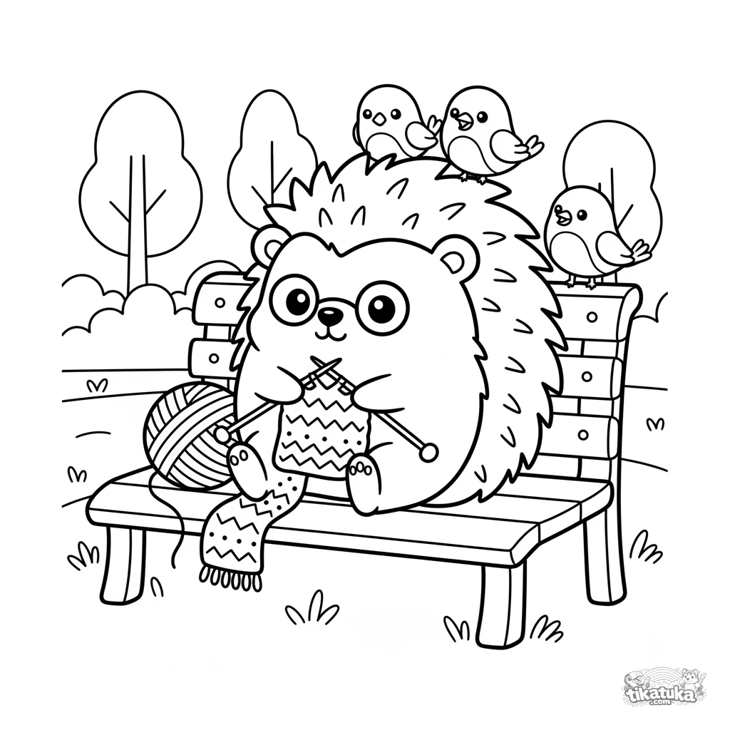 Página para colorear para niños de 4-6 años: un erizo tierno tejiendo una bufanda. Estilo kawaii, composición simple.