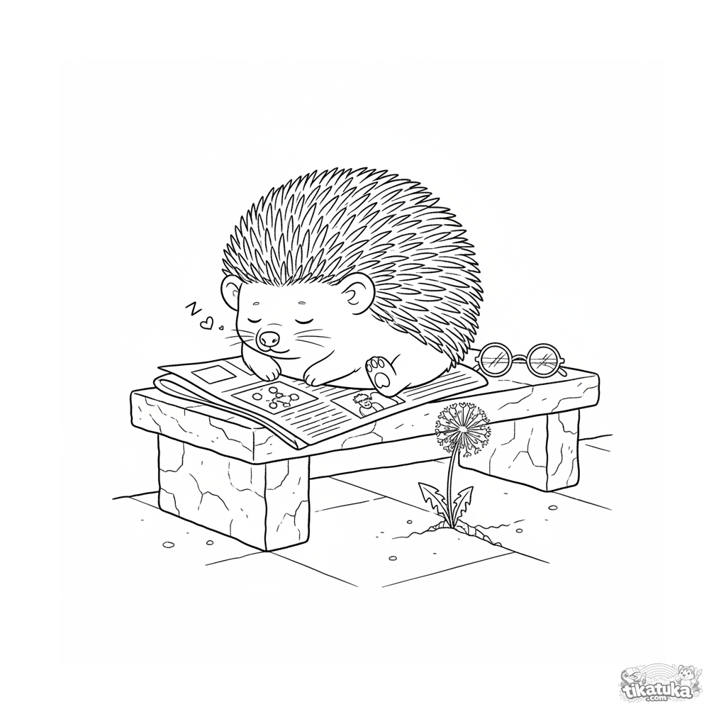 Página para colorear detallada para 10-12 años: un erizo realista duerme en un periódico en un banco del parque. Con gafas y un diente de león, escena urbana acogedora.