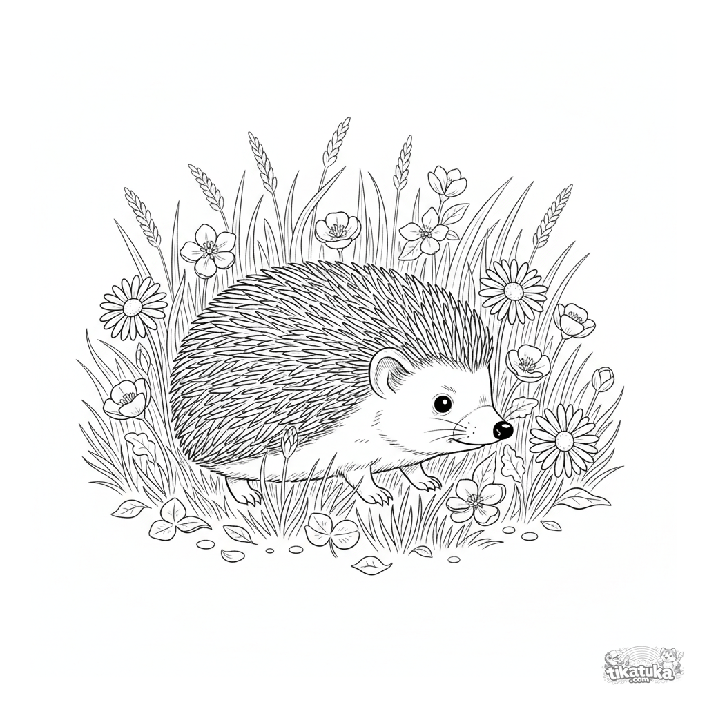 Página para colorear detallada para niños 7-12: un erizo con expresión curiosa explora un prado primaveral lleno de flores silvestres. Estilo grabado estilizado, líneas limpias.