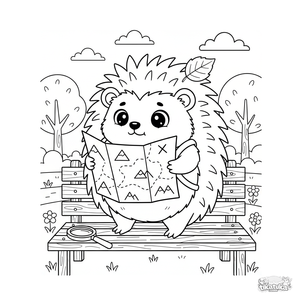 Página para colorear para 7-9 años: un erizo aventurero con mochila estudia un mapa en un banco. Escena divertida y dinámica.