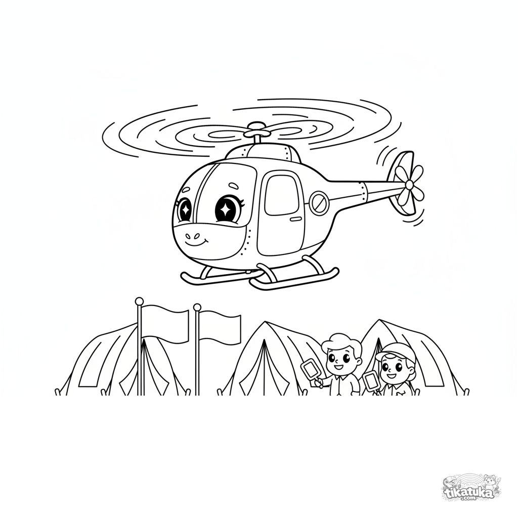 Página para colorear para niños 4-6: un helicóptero aterrizando cerca de un cuartel de campaña. Escena con tripulación, banderas y tiendas, líneas dinámicas.