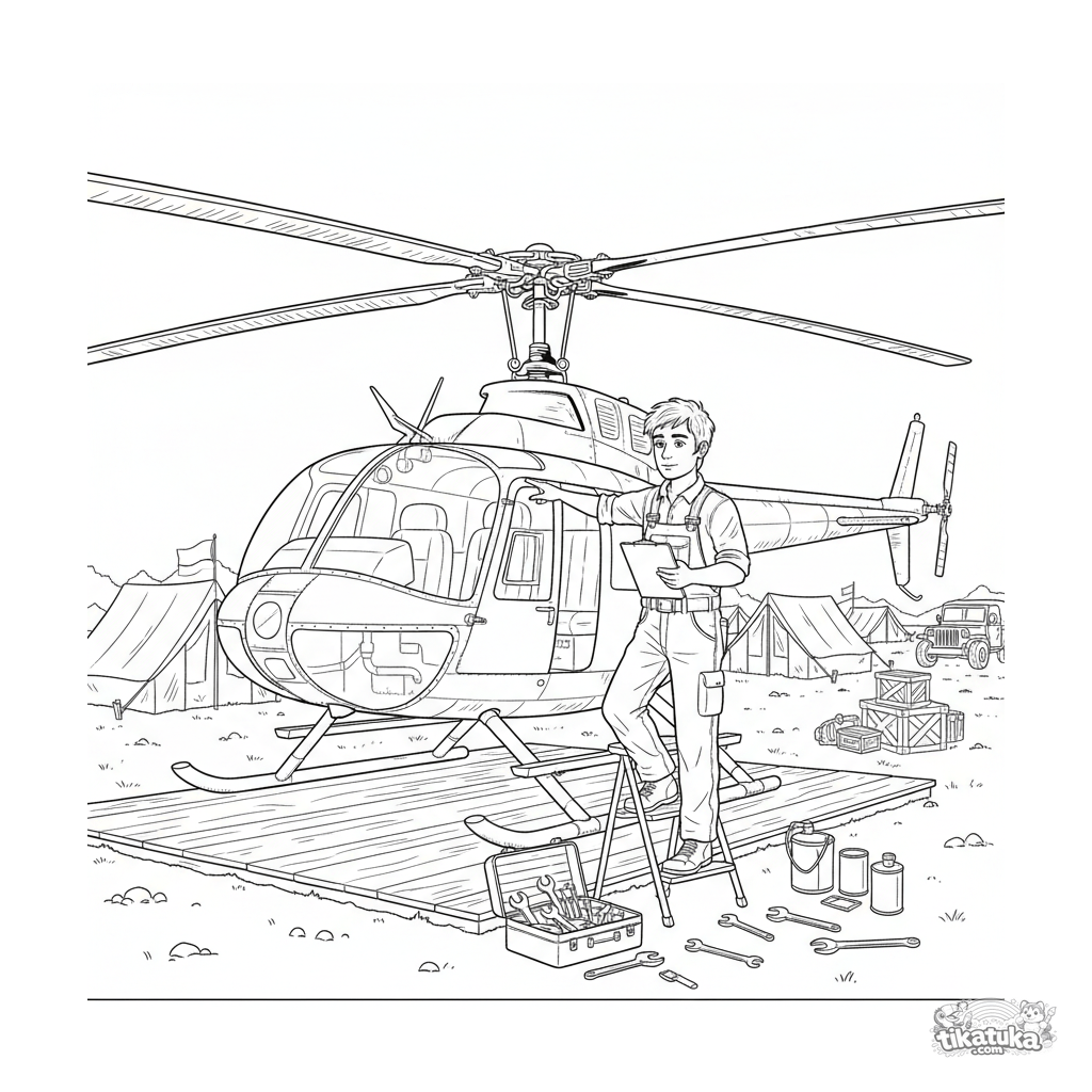 Página para colorear detallada para 10-12 años: un mecánico revisando el rotor de un helicóptero cerca del cuartel general de campaña.
